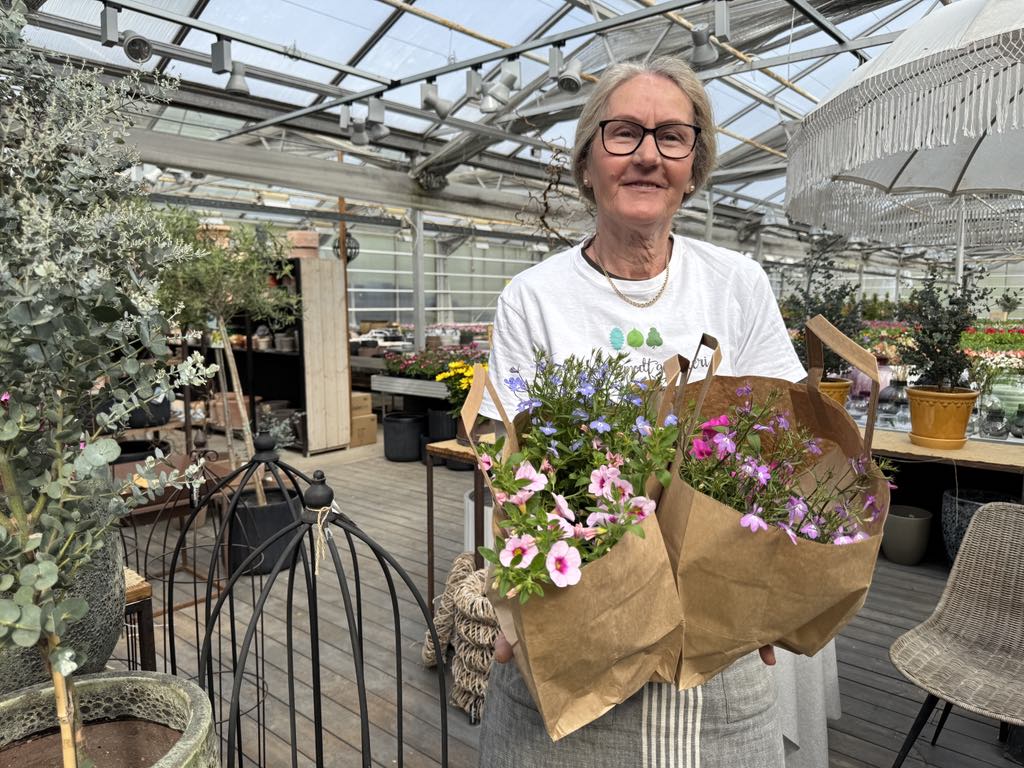 En smilende Karin Turid Aamodt fra gartneriet delte ut blomsterposer og kunne fortelle at dette er trivelig.